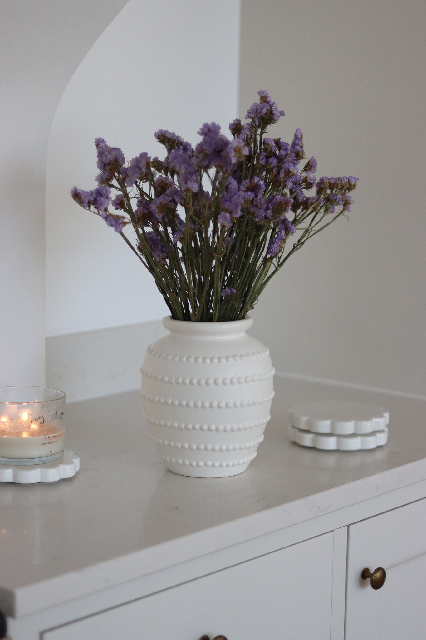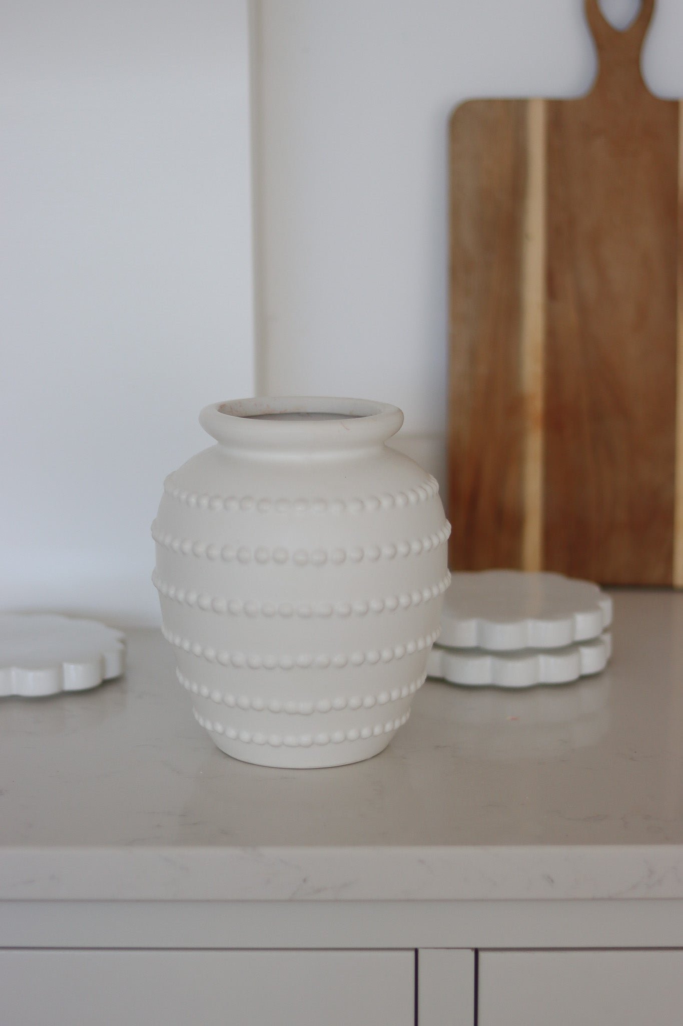 Add texture and interest to your home with this beaded white ceramic vase. Finished in a soft white tone with delicate beaded detail, this ceramic vase works beautifully styled as a simple vase and flowers pairing or filled with faux flowers for a long-lasting display.